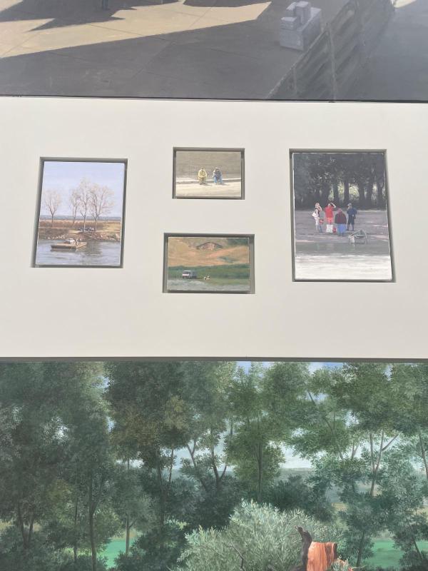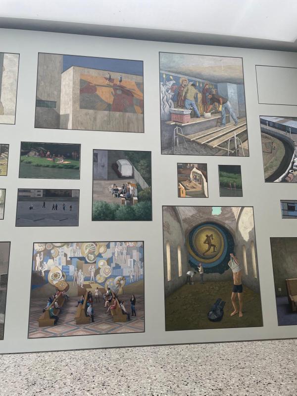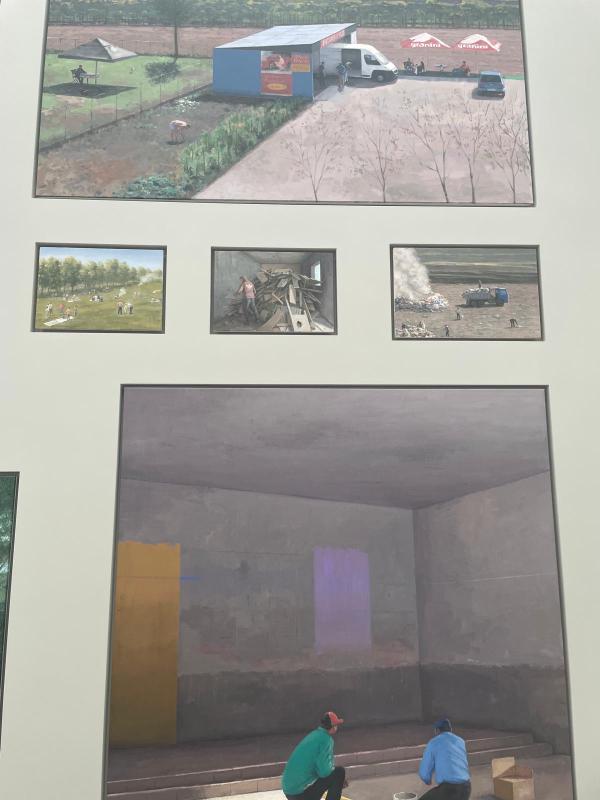 All the images were painted in that modern, hazy way. The kind of render where you can tell some kind of screen has mediated the image-making ā either painted from a photo or pulled from the internet. All flat and milky. Images of work. Images of leisure. Images of people at rest. There were many paintings of people sleeping in empty spaces. There were many paintings from up high, perspective on a tilt from that droneās eye shot. The paintings were all different sizes. Some quite massive, some the size of a notebook. The floor to ceiling, wide wall panoramic install was overwhelming and flat ā all the paintings were flush with the wall, nestled into perfectly cut alcoves. It felt less like a salon hang and more like an enormous altarpiece, but I still donāt know if that likeness was just a projection of my desire to be elsewhere. Specifically, my desire to be in the basilica, gazing up at the Pala dāOro ā that Byzantine Dark Ages masterpiece, golden altar with enamelled paintings of saints and angels. No, no ā they feel parallel in their flatness, the clusters, many images forming one wide block. The labouring body, images of work. The divine body, celestial image.