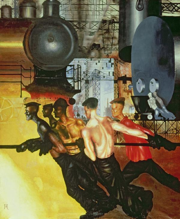The genre contains this specific way of depicting workers and work. In Yuri Pimenovās Increase the Productivity of Labour, five men haul or heave something in or out of the foundry flames. They are all (but one) barechested, diagonal with exertion, stoic and focused. Pavel Filonovās Record Breaking Workers at the Factory, women hunch over sewing machines in cherry red colours. Posterised paintings of cheerful, red cheeked workers, arms raising their sickles to the sky. Or raising a red flag. Or both red flag and sickle. Always smiling. Vladimir Lenin salutes a crowd of cheering men in work jackets, red flags waving behind him. Theyāre happy to see him, happy to hear him. Women working a field, golden with wheat and sunlight. The New Soviet Man, Alexei Stakhanov, a coal miner from Donbas. On 31st August 1935 he mined 102 tons of coal in less than 6 hours, 14 times his quota. His face was printed on posters and in newspapers as an example for other workers to follow. It gave birth to a whole Stakhanovite movement, workers who overshot their production targets were called Stakhanovites, a kind of national hero. Itās a different kind of romanticisation, but nonethelessā¦