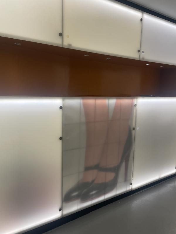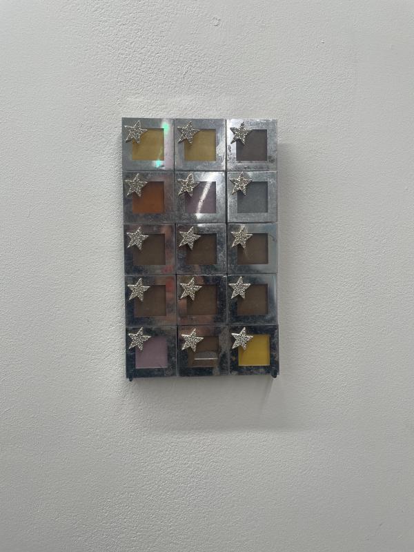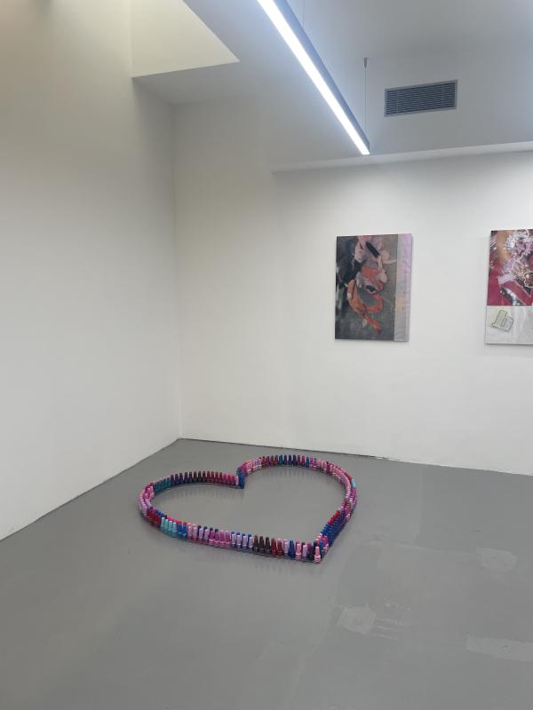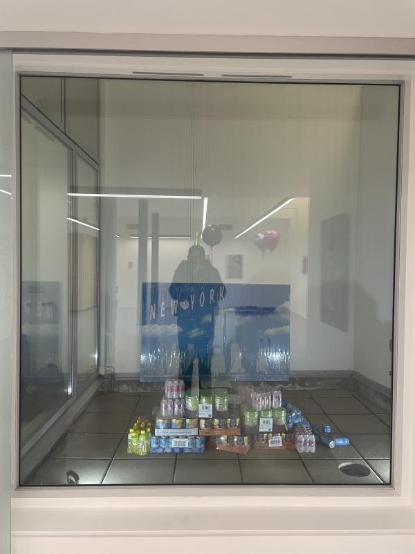 I am in the gallery, Indigo + Madder, for Athen Kardashian and Nina Mhach Durban’s exhibition: Much love I leave behind. The gallery has a little courtyard boxed in by a window. It’s like an open air vitrine, only a couple meters wide. I can’t stop glancing over at it, the most enigmatic artwork is locked away inside. A pile: tins of alphonso mango pulp, kesar, rubicon fizzy mango, lychee drinks in screw cap bottles. All of it is in bulk, plastic wrapped, from the cash and carry. The pile is like an offering, propping up an image: a massive blown up print of a postcard from New York, iconic 90s skyline (complete with twin towers) from across the water. The postcard sky is so blue and so big. The postcard image is so sticky and shiny, laminated or plastic wrapped, trapped air bubbles and creases blistering across the buildings. It’s like a weird shrine, not for a god or anything that monumental. A shrine for something small, secret, an image spirit, a discrete image language.