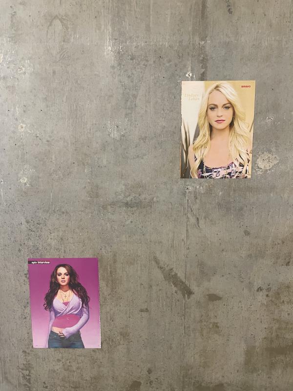 When it rains, will the print in the courtyard start disintegrating? Will the ink run and bleed and — I love it when you see laminated posters on outdoor noticeboards and the colours have gone all watery and sunbleached. I love it when something looks authentically weathered. That never happens to Reubens, Bacon or Mondrian! These important, revered images never feel the touch of time. Maybe the postcard print will dissolve entirely. Just fizz away like a bathbomb or a urinal cake, loveheart candy, we are here to witness its demise and this is a temporal thing.