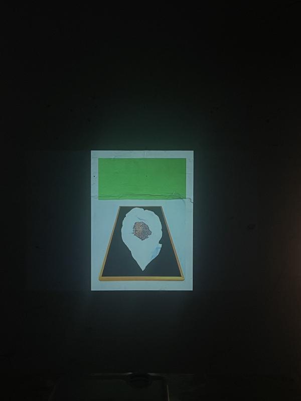Another image I canāt quite work out. It has so much mystery within it. Two rectangles: one is lurid green and landscape, the other is black with a gold frame, portrait and disappearing towards a vanishing point on the horizon of the green rectangle. In the middle of the black rectangle thereās a white crumpled shape, like an upside down tear. And what looks like a small brown rock nestled into its folds. I canāt tell if this is a photograph of an installation, or a weird assemblage, found or constructed. Maybe it is also a very precise painting, collage, drawing. Even more confusing for my eye than the two images of the ruined city, the images that could be photos or paintings, the dread and illusion. I donāt know what manner of objects I am even looking at, parsing a purpose or meaning is completely futile. And under that, the deeper confusion that ā of all the things this could mean, it could also equally mean nothing. It could be something with an absence of meaning, something that rejects meaning, something that exists on a plane beyond anything as trite as meaning. I think, at the very least, that the thing nestled into the crumpled white ā I think that is a rock.
