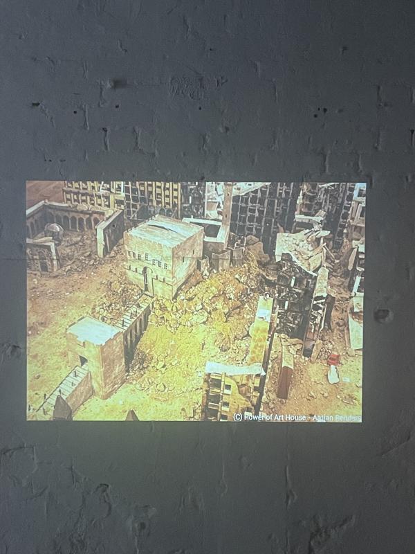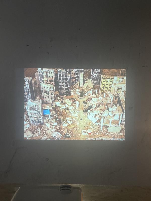 Then two images ā similar but on the other side of the room. I canāt tell if they are paintings, drawings, photographs of a bombed out city from above, photographs of a miniature model of a city. The image has a texture that feels like eye fuzz, grit, pixel blur, any and all of these things. I try and focus on the size and shape of the windows, the colours, the shadows, try to pick out their depth and gauge a sense of scale from there. The rubble is very large, more likely to be a miniature model. No ā those arenāt shadows, those are lines, shading. That newspaper is bigger than that window. If this was a photograph, what perspective would it even be shot from? How could this ever be real? It fucks with what I understand as believable, I canāt understand it as true, and still ā I have seen those images, from when the BBC was finally allowed to fly a drone over northern Gaza. The buildings, a city turned to literal dust, literally flattened, an expanse that is almost liquid it has been so completely destroyed. As I am writing I am trying to google it, I cannot find the single exact image I am thinking of, because there are so many images of Gaza that fit this description. It defies time, defies my belief, I know it is real and I cannot metabolise it. It is the horror of standing at an edge before a sickening drop, the horror just as the rollercoaster tips over the highest peak ā looking down over something, creeping dread. The image, this image, this horror. There is a sense of flatness between the background and foreground, like the pictorial plane is collapsing in on itself, levelling, not as deep and pushing me out, my eye skimming over and not getting a way in entirely ā the image flips before I am really able to figure it out.