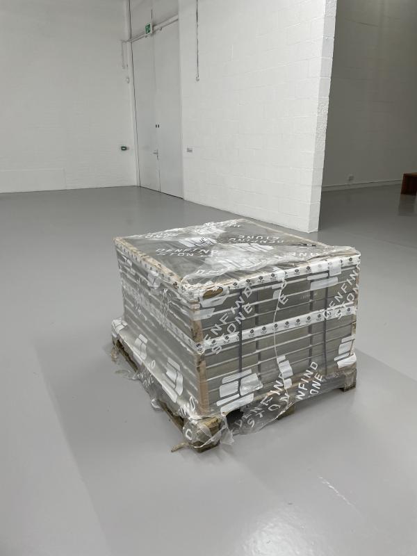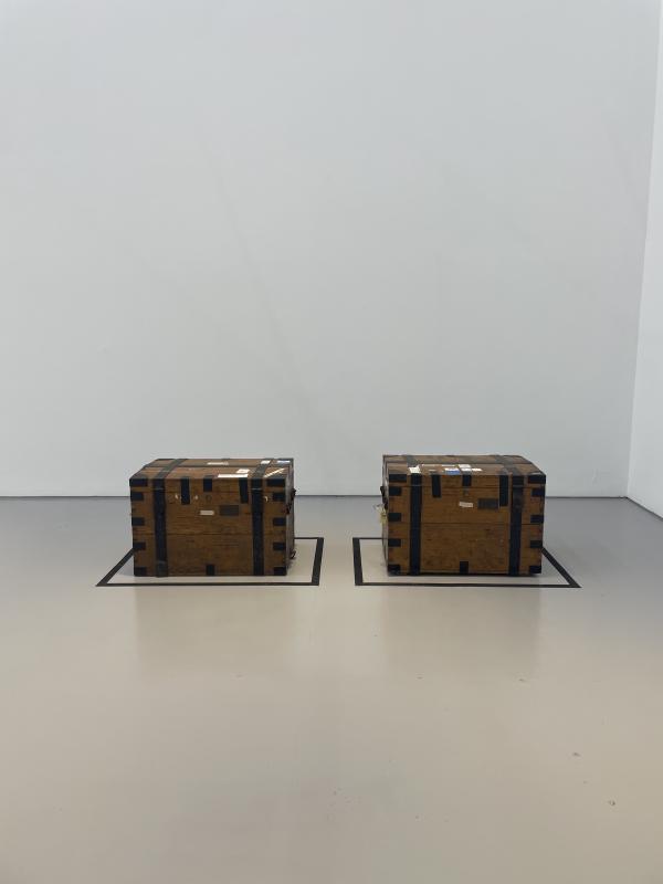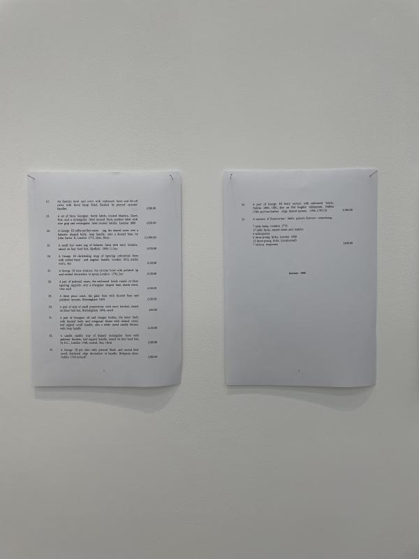 The final pair is perhaps the most interesting. In this central room, in this heart of the gallery we have two inheritances. One belongs to Graham Randles from Liverpool, the other to Sir William Alexander Noel Henry Bellingham, 9th Baronet Bellingham. Graham’s inheritance: 240 porcelain chamber pots, laid out here in a strict grid. Sir William’s inheritance: about £30,500 worth of Georgian silverware. You must assume, as the silver is locked away in these two wooden chests. On the wall there is an itemised list of the contents: salvers with crests and fine etchings, teapots and sugar bowls, candlesticks and cream jugs with decorative allegorical scenes. The chests arrived late, two weeks after this exhibition opened. The artists had to navigate a complex bureaucratic process to retrieve the silver from the heir’s family bank vault. It arrived here in an armoured and insured lorry, it was so heavy it needed to be moved by forklift. Yes, yes. Maybe this is my opportunity to confess to you. If you were an ordinary member of the public, I would say: Only the curators have seen the silver with their own eyes. I couldn’t open the chests for you. They are padlocked shut, the keys resides someplace secret. Technicians have taped the chests shut, creating a kind of seal that would alert security of any breaches. We are only a humble gallery, but our artworks must be kept safe. But I believe we have a… kind of understanding between us. I will clear my conscience.