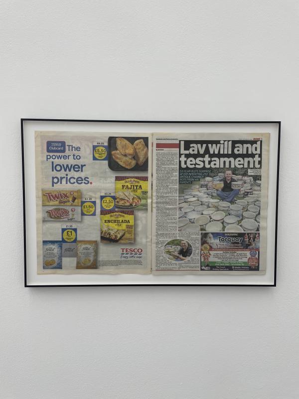 Of all the diptychs, this one is set to go to auction after the show has closed. The artists have plans to sell the two inheritances together, a job lot of silver service and piss pots. The irony mustn’t be lost. Over in that far corner you will see a newspaper spread — a 2023 issue of the Liverpool Echo where a journalist has interviewed Graham Randles. Graham admits he has been trying to sell the chamberpots on Facebook Marketplace, but has had little luck in shifting them. The silver too. In reviewing this exhibition for the Guardian, one Mr Evan Moffitt remarked that Sir William was inclined to grant the artists access and use of his family silver — it had become something of an emotional burden to him. The Bellingham family has a reputation for losing entire estates in card games. Miraculously, the family silver has survived this profligacy. It too has proved difficult to shift. Until now.