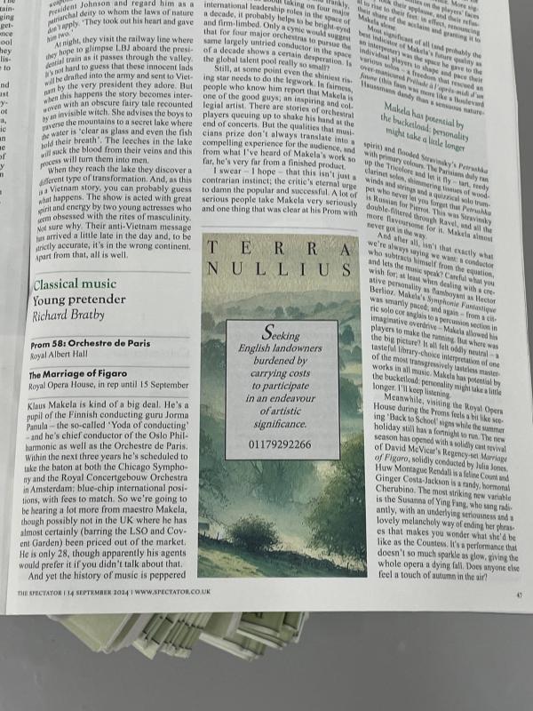 As you walk in, a stack of papers, September issues of the Spectator Magazine, open on a page with an unusual advertisement. TERRA NULLIUS, it reads — that is, Nobody’s Land! A land without a lord! I might fail to mention that lack of allodial land, the parcelling up of every square inch of England, the fact that by law, land must have a lord. But perhaps we esteemed colleagues might understand this all as a motivation for the advertisement’s call to action. Seeking English landowners burdened by carrying costs to participate in an endeavour of artistic significance. And then a phone number with a Bristol area code, where this very gallery is situated — yes, well spotted.