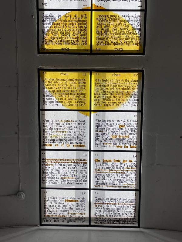 Over on the other end of the gallery, a third pair. A pallet of Scottish sandstone from the same geological seam as the Stone of Scone. Have you heard of this stone? You should know it, you godless English. It was used as a throne to crown Scottish Kings, stolen in the 13th Century by an English King, Edward Longshanks, Hammer of the Scots. Ever since then it has sat under the Coronation Chair in Westminster Abbey — symbolic, is it not? Edward Longshanks invaded Scotland, won, rode to Berwick, forced the Scottish barons to swear fealty to him. The subjugation of Scotland beneath an English King, represented in the capture of this stone, for it to now sit under the chair of all English Kings, forever. You know, the Stone of Scone is rumoured to be the Stone of Jacob. According to the book of Genesis, Jacob tricked his (older) twin brother Esau out of their father Isaac’s blessing of the first-born, and so tricked him out of his inheritance. Jacob fled, making his way to Harran. He stopped for the night in Bethel, taking a stone and laying his head on it to sleep. He had the most unusual dream, seeing a stairway to heaven full of angels, and the voice of God proclaimed that he will give to Jacob and his descendants the land on which he was lying. When he woke, Jacob consecrated the stone and declared Bethel to be the gate of heaven. That is the same stone that rests under the English King’s chair — apparently. But how could it be, when this tonne of Scottish sandstone was quarried from the same place — Perthshire, not Bethel. In this far room we have a stained glass window with a passage about a vision, the dream of Esau. Cheated out of his birthright, he dreams of lying his head on a stone that whispers to him. A golden plough turns into a chain of molten iron, fields bind the earth in a gilded cage. Esau swears his allegiance to the wild places, the untamed land, the blessing of exile. The forest speaks to him in green fire, in bronze serpents, warning him: ‘do not grasp what chains thee, for power is a trap. The earths true gift is not what thou canst hold, but in what thou canst release. Seek not dominion, but knowledge; seek not mastery, but harmony.’ The leaves sing ancient songs to him and Esau understands that he has been spared the burden of his birthright, that it was a kind of curse. A parable for Kings, for those who would place one man above another, is it not? The legal fiction of a sovereign’s divine right, countered by the sacrament of wilderness.
