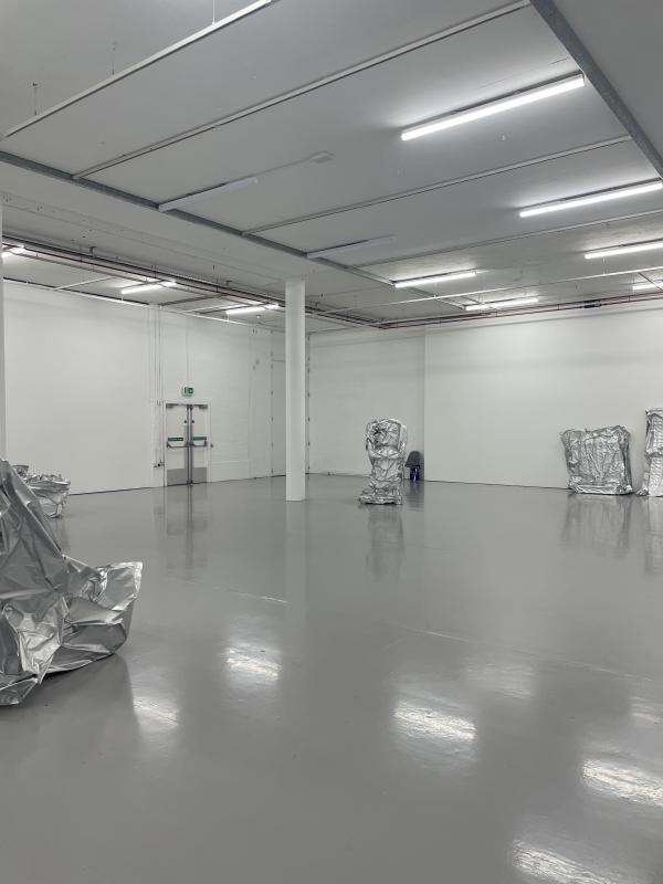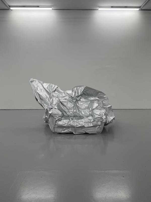 The rest of the work from here appears to us in pairs. Fly Tip: a series of objects scavenged from the streets, illegally dumped and left for dead, the artists have commandeered them and vacuum sealed them in enormous elfbar bags. They take on the shape of monstrous Cronenbergian sculptures — what was once a sofa is now gnarled and whipped into a ghastly aluminium wrapped jagged form. And here, a board, a sink. If you glance to the other side of the gallery, you might spot a set of drawn red velvet curtains hanging on the wall. Rescued from the bin outside 44 Kinnerton Street, Belgravia. The house was in the middle of an estate clearance. Its former owner, Ghislaine Maxwell, had been arrested. Her family were trying to raise funds by selling the house. Curtains and sofa, dumped on the street. Different, the same, disposal is disposal is disposal.