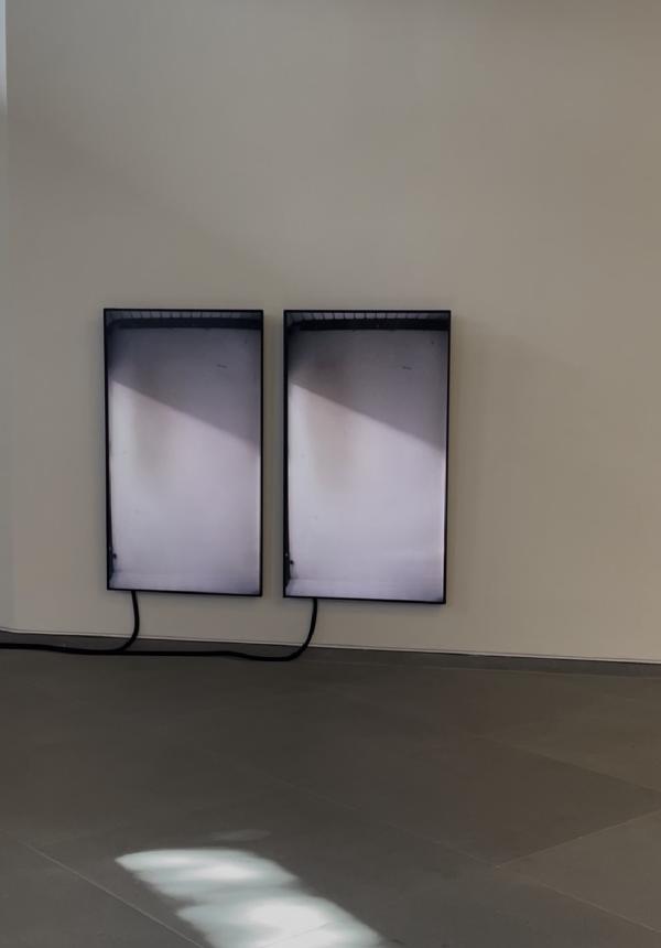 THE MACHINE is on a trolley in the middle of the space. It is a big metal box with one side open. There is a camera lens wired into the top. My friend sticks his hand in. It flashes greyscale on wall-mounted screens behind the box. I stick my hand in, I wave. I lower my head to get a look at the camera. The man behind the desk tells us we are obviously not meant to stick things in the box. It is some kind of medical imaging device and it is monitoring the light in the space. I look at the back wall where there’s a long thin window, like in castles. It casts a creased shadow inside the box. We watch the shadows shift inside the box and on the screen as we walk around.