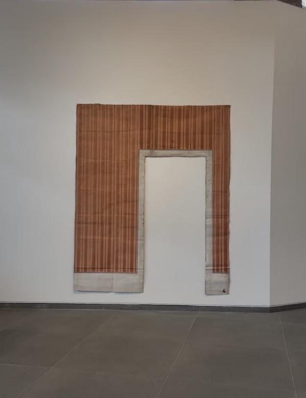 The FALSE DOOR is a large piece of paper, probably a theatrical set backdrop with a cutout door. The paper is thick, old, painted with pink stripes like whacky wallpaper. There are smears of glue up top. It hangs on hooks on the wall. It leads nowhere.