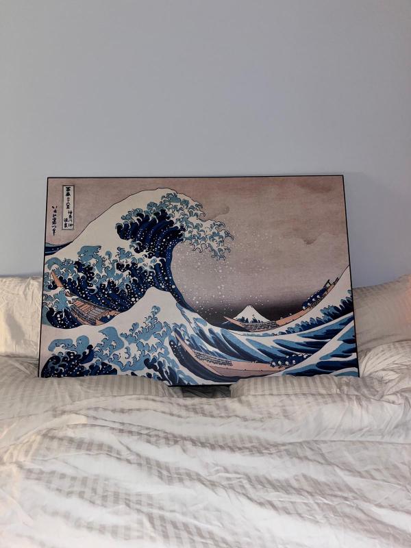 My boyfriend walks into the bedroom where I am staring at his meter long slightly shiny wooden print of Hokusaiβs The Great Wave off Kanagawa. He is smiling at me. He is pleased.