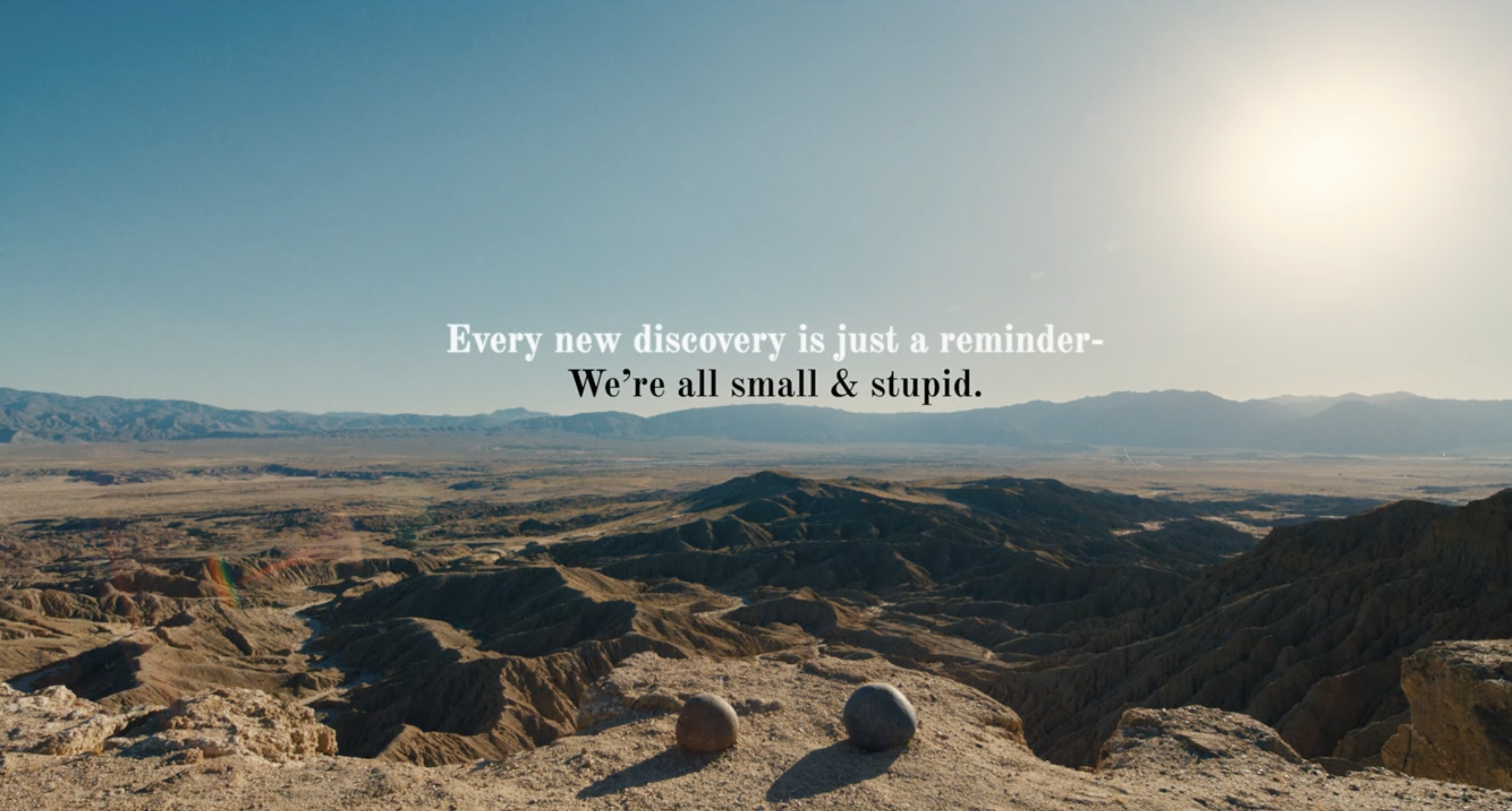 A subtitle hangs over the misty desert horizon. It is Joyās rock saying, āFor most of our history, we knew the Earth was the centre of the universe. We killed and tortured people for saying otherwise. That is, until we discovered that the Earth is actually revolving around the Sun, which is just one sun out of trillions of suns. And now look at us, trying to deal with the fact that all of that exists inside of one universe out of who knows how many. Every new discovery is just a reminderā,ā and Evelyn cuts in that, āWeāre all small and stupid.ā Joy underlines the sentiment by saying, āWho knows what great new discovery is coming next to make us feel like even smaller pieces of shit.ā